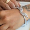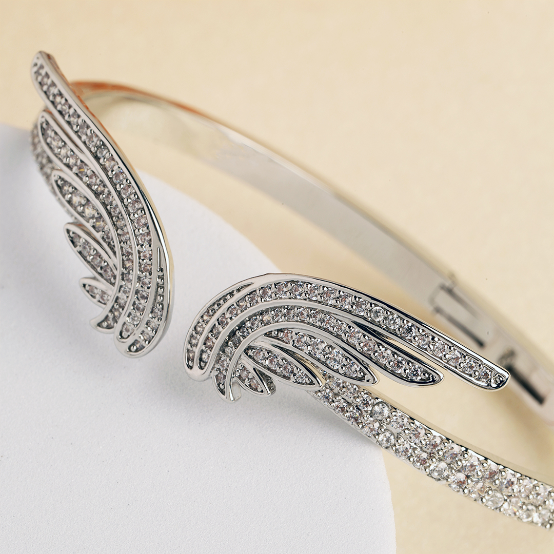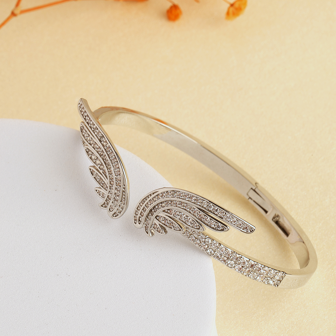 The Arzu Feather Kada-Silver is a graceful embodiment of ethereal charm and modern sophistication. Designed with delicate feather motifs encrusted in shimmering stones, this exquisite kada adds a celestial touch to your look. Whether paired with an elegant evening gown for a luxe statement or stacked with minimal bracelets for a chic daytime appeal, it seamlessly elevates any ensemble. A perfect blend of elegance and edge, this piece is your go-to for effortless glamour and timeless allure.