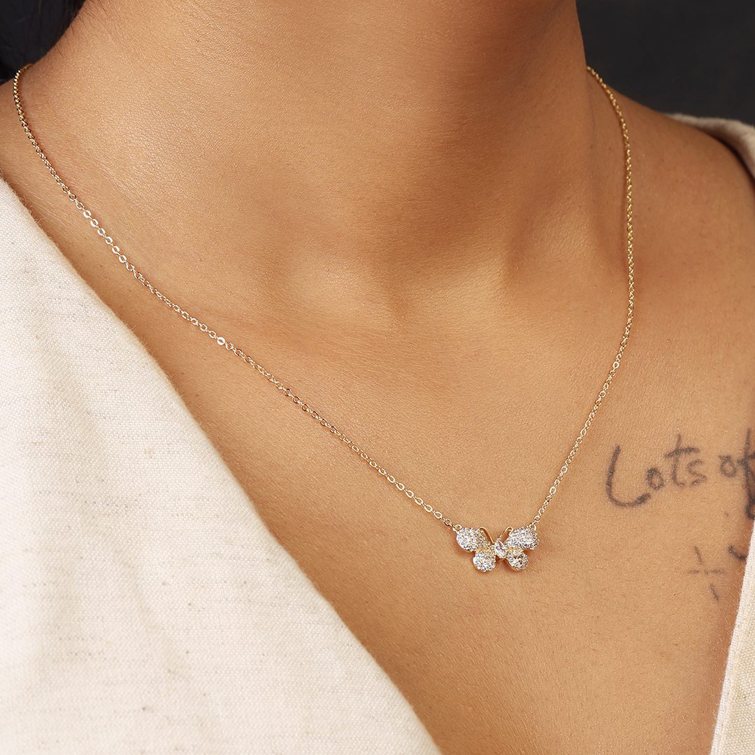 Delicate yet captivating, the Butterfly Diamond Pendant – Gold is a symbol of transformation and grace. Crafted in sleek gold and adorned with dazzling diamonds, this pendant captures the ethereal beauty of a butterfly in flight. Its intricate detailing and shimmering accents make it a timeless addition to any jewellery collection. Versatile and elegant, it pairs effortlessly with flowing dresses, tailored blazers, or minimalist ensembles. Whether worn solo for a refined statement or layered for a modern touch, let the Butterfly Diamond Pendant elevate your style with its graceful charm.