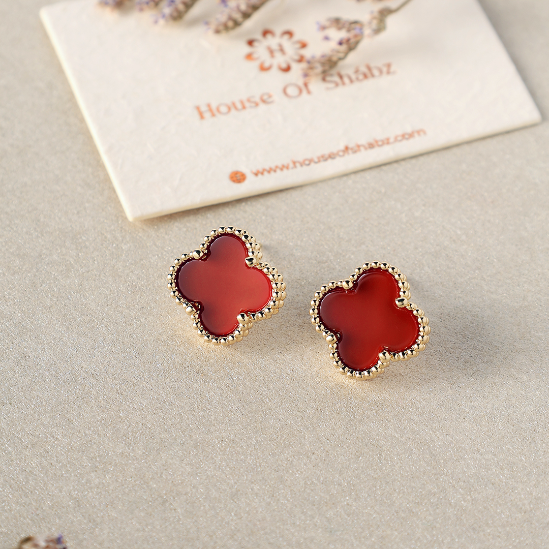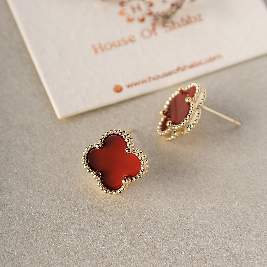 These striking stud earrings, the Red Agate Stone Earrings, feature a rich, deep red agate stone cut in a clover-inspired shape, bordered by a delicate, textured gold-toned trim. The design offers a bold pop of color with a touch of classic elegance. Perfect for adding a vibrant accent to both everyday outfits and more special occasions. These earrings are ideal for those who appreciate natural beauty and want to inject a touch of rich color into their style. Let this eye-catching pair elevate your look with their unique stone and elegant detail.