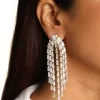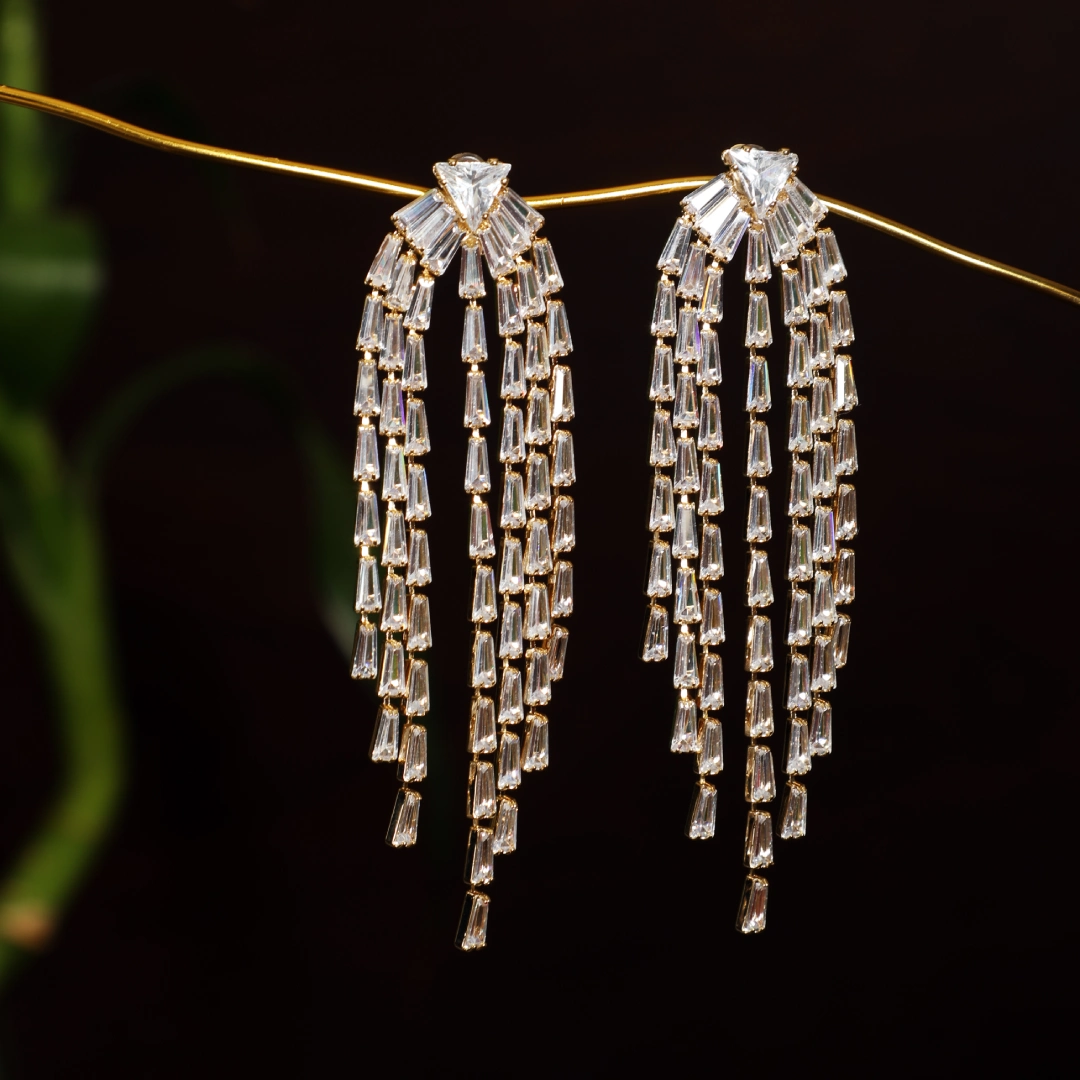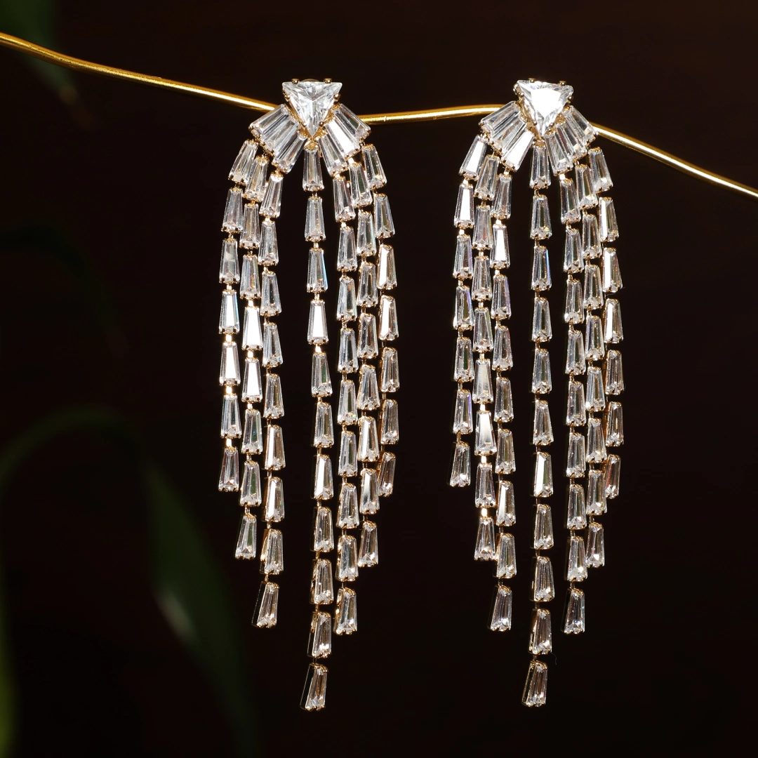 All drama, no apologies. The Zenovia Danglers cascade like liquid light—tiered with baguette-cut brilliance that catches every flicker of movement. Anchored by a bold triangle stud, they’re designed to dazzle with intention and attitude. Perfect for black-tie soirées, wedding receptions, or cocktails where you’re the main character. Pair them with an off-shoulder gown, a sleek chignon, and a glass of something sparkling. Instant red carpet energy